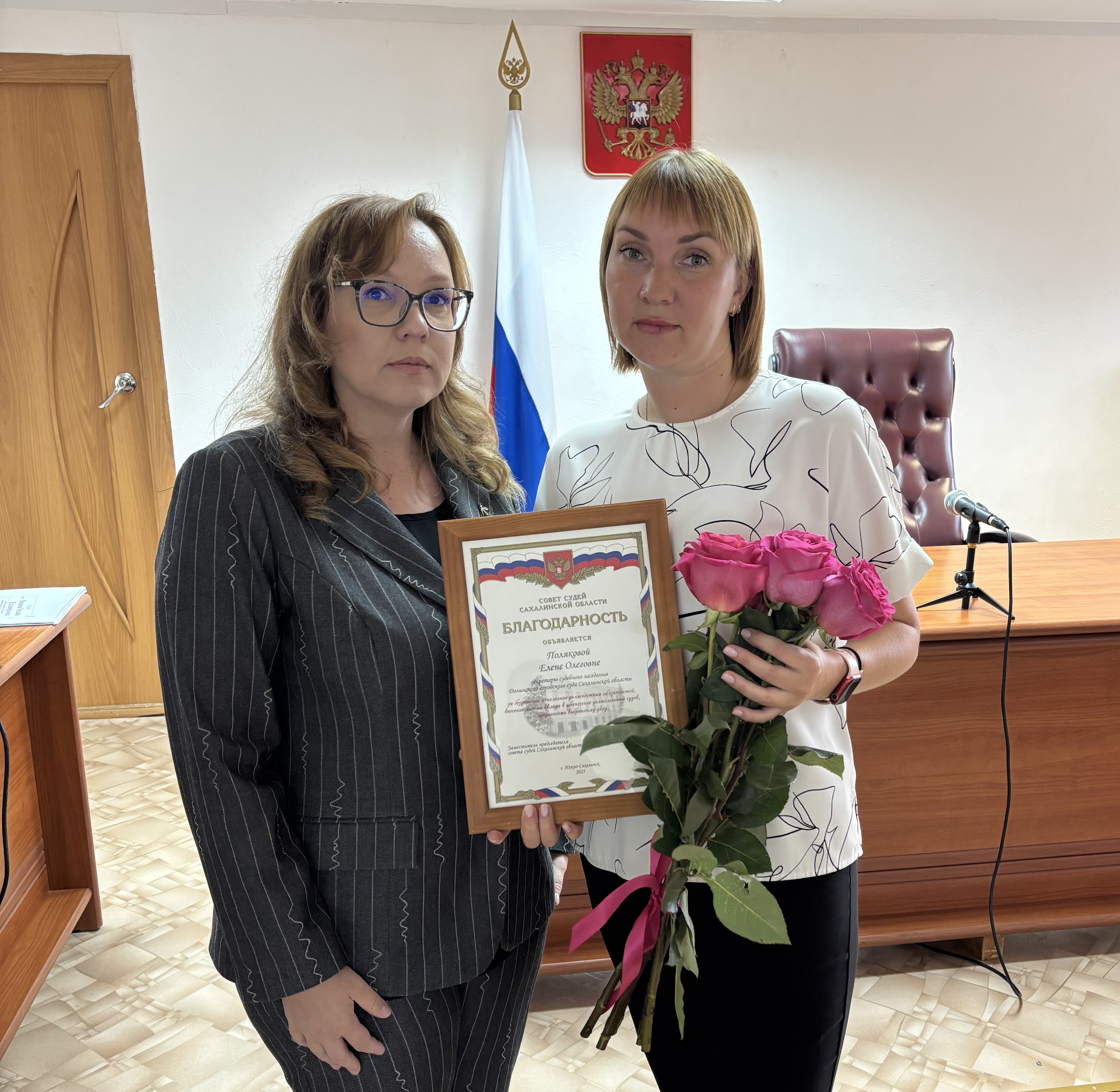 «Об объявлении Благодарности совета судей Сахалинской области» За безупречное исполнение должностных обязанностей, внесение большого личного вклада в обеспечение деятельности судов, преданность выбранному делу объявлена Благодарность совета судей Сахалинской области Поляковой Елене Олеговне, секретарю судебного заседания Долинского городского суда Сахалинской области. Председатель Долинского городского суда Воищева Оксана Владимировна в торжественной обстановке от себя лично и от коллектива поздравила Елену Олеговну с заслуженной наградой. Пресс-служба Долинского городского суда